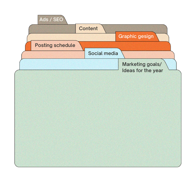 Marketing plans, content calendars, social media posts, ads, design assets; everything exists somewhere.